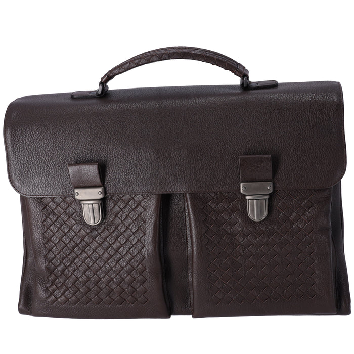 Bottega Veneta’s iconic Intrecciato weave takes on a refined, professional edge in this dark brown leather business bag. The craftsmanship is unmistakable, balancing quiet luxury with practical function.